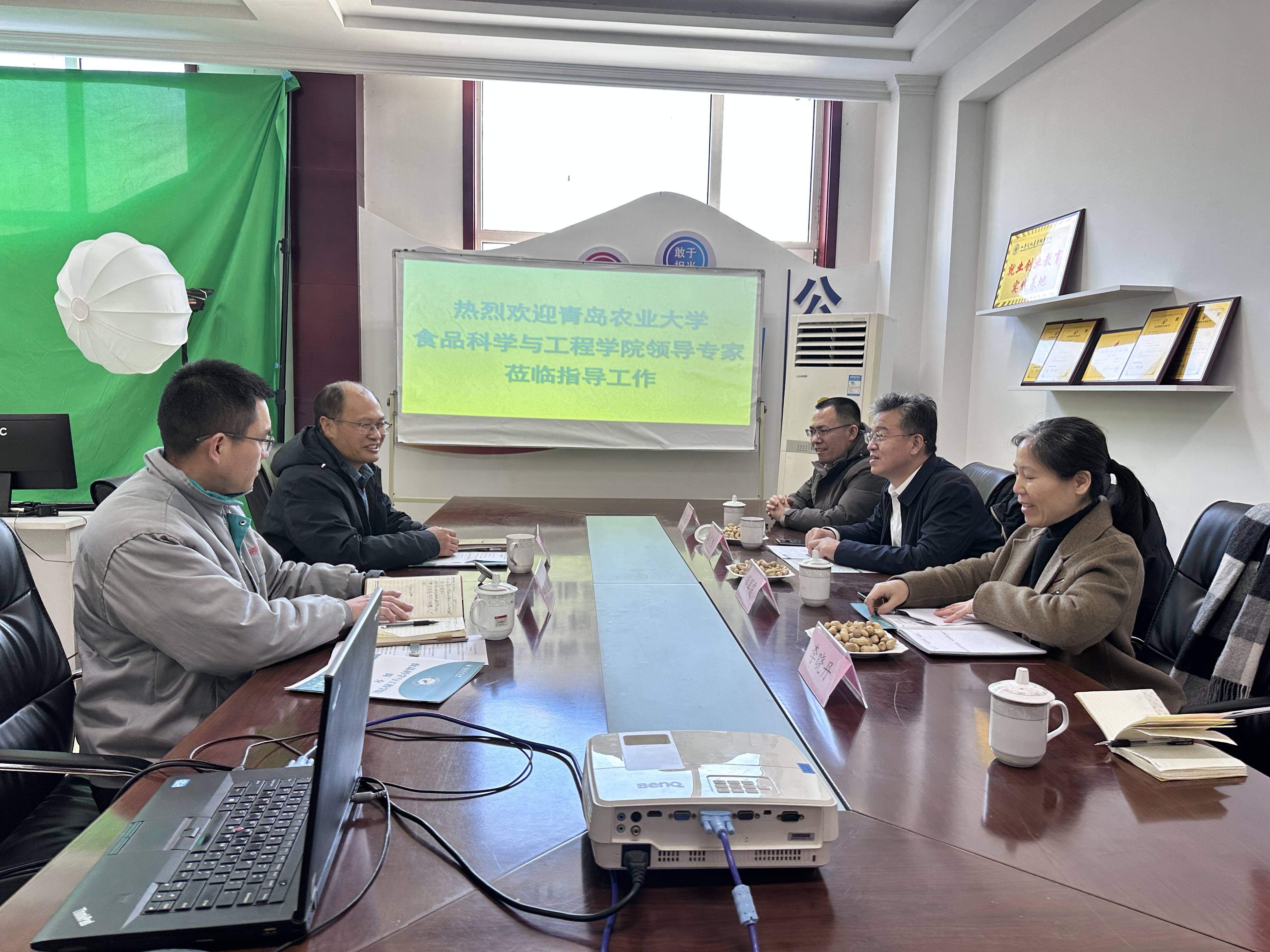 1月21日,青岛农业大学食品科学与工程学院党委书记车广杰和学院副院长肖军霞一行四人到青岛秋润食品有限公司进行访企拓岗和青岛农业大学山东省农产品深加工与安全现代产业学院实习实训基地挂牌。 秋润食品公司经理张延海介绍了公司生产经营情况,青岛农大食品学院副院长肖军霞介绍了山东省农产品深加工与安全现代产业学院建设情况,双方就产品开发、学生实习等问题进行了探讨,并举行了山东省农产品深加工与安全现代产业学院实习实训基地授牌和企业产品研发专家聘任仪式。