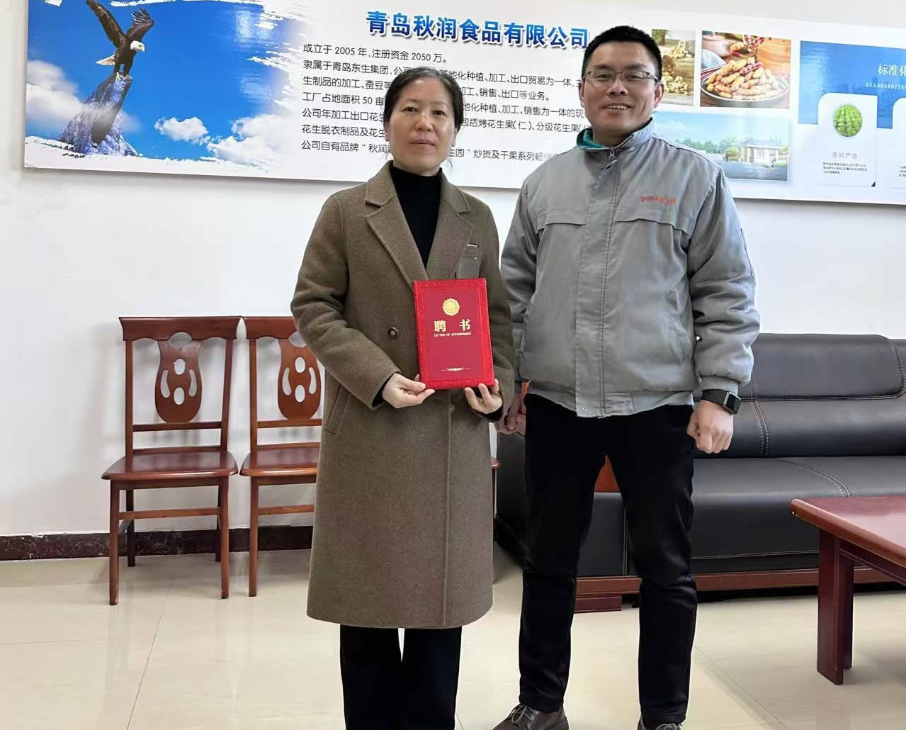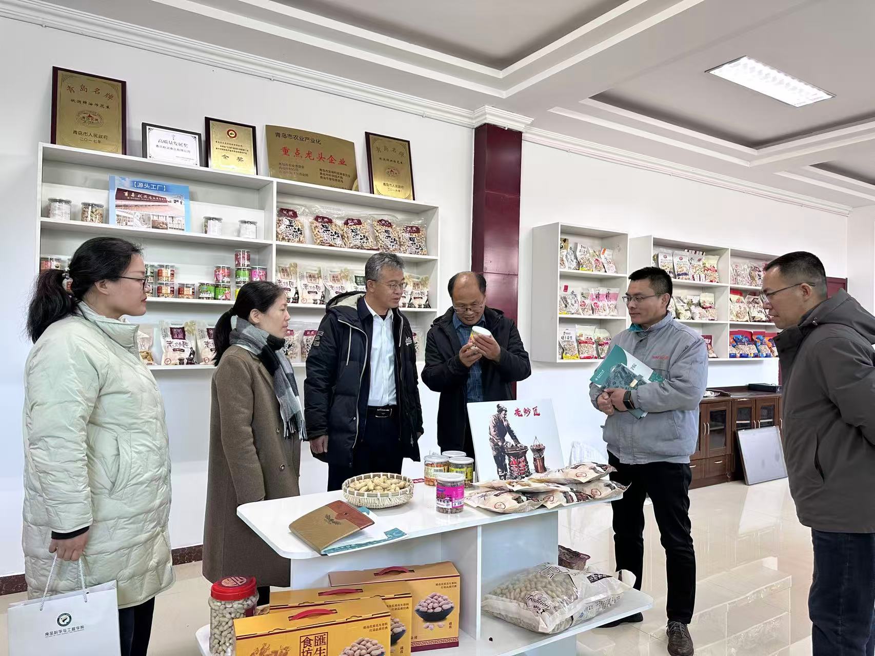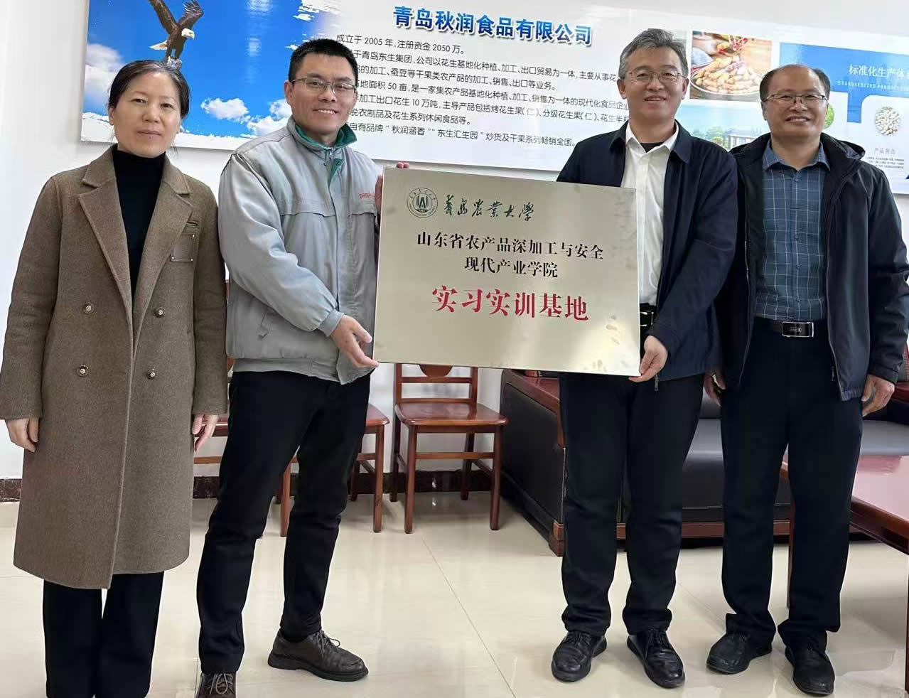 1月21日,青岛农业大学食品科学与工程学院党委书记车广杰和学院副院长肖军霞一行四人到青岛秋润食品有限公司进行访企拓岗和青岛农业大学山东省农产品深加工与安全现代产业学院实习实训基地挂牌。 秋润食品公司经理张延海介绍了公司生产经营情况,青岛农大食品学院副院长肖军霞介绍了山东省农产品深加工与安全现代产业学院建设情况,双方就产品开发、学生实习等问题进行了探讨,并举行了山东省农产品深加工与安全现代产业学院实习实训基地授牌和企业产品研发专家聘任仪式。